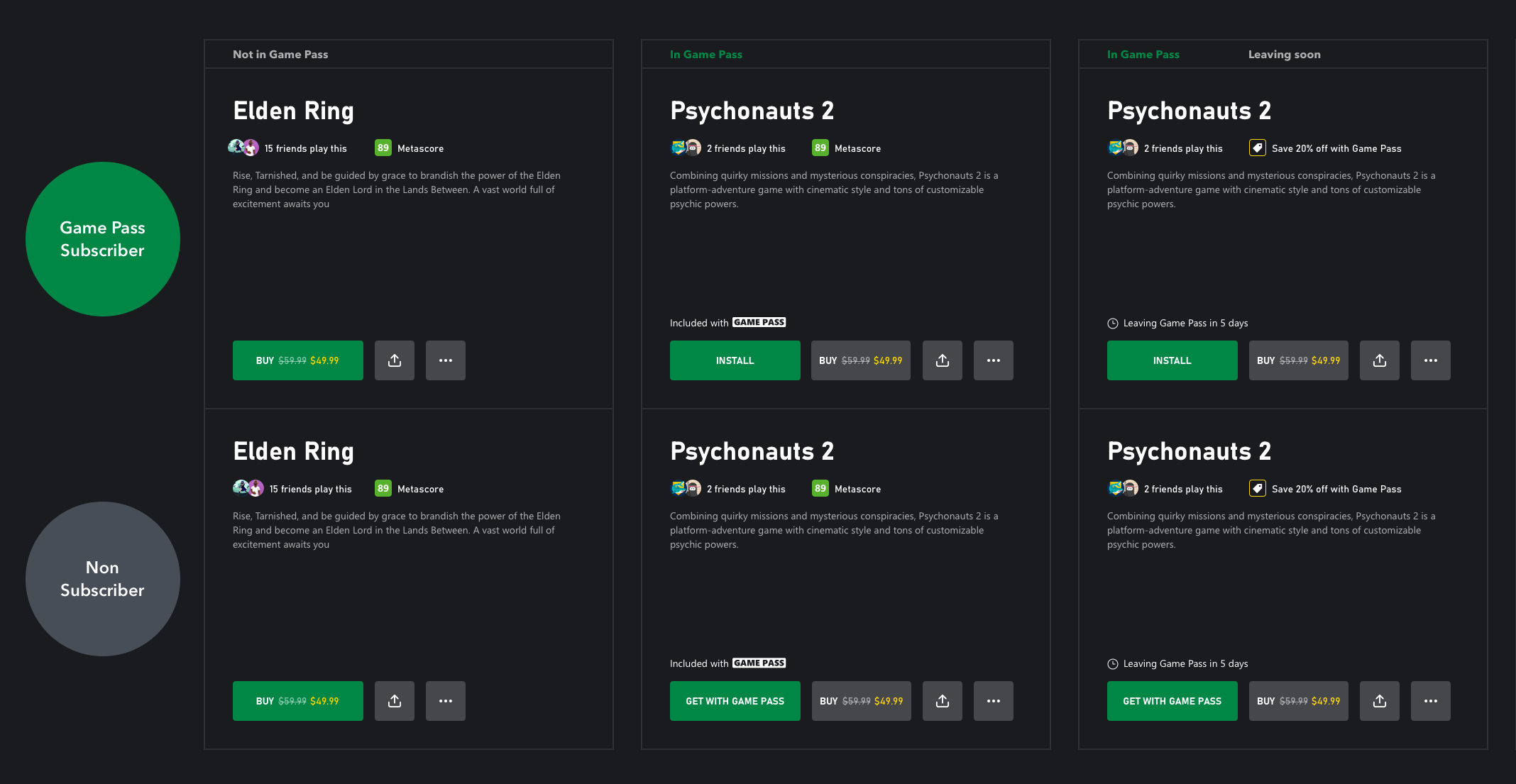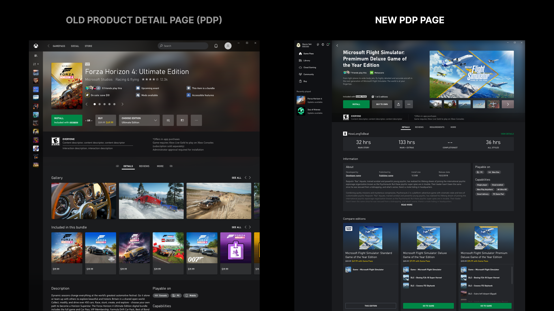 My main feature area for PC Game Pass is the PDP. Since I joined we had started to get a lot of feedback from UR and LT on confusion in the above the fold actions row so I joined forces with a store designer to help make changes to PDP based on feedback and also advocated for 3PP feature partnerships like HowLongToBeat to enhance the subscriber experience