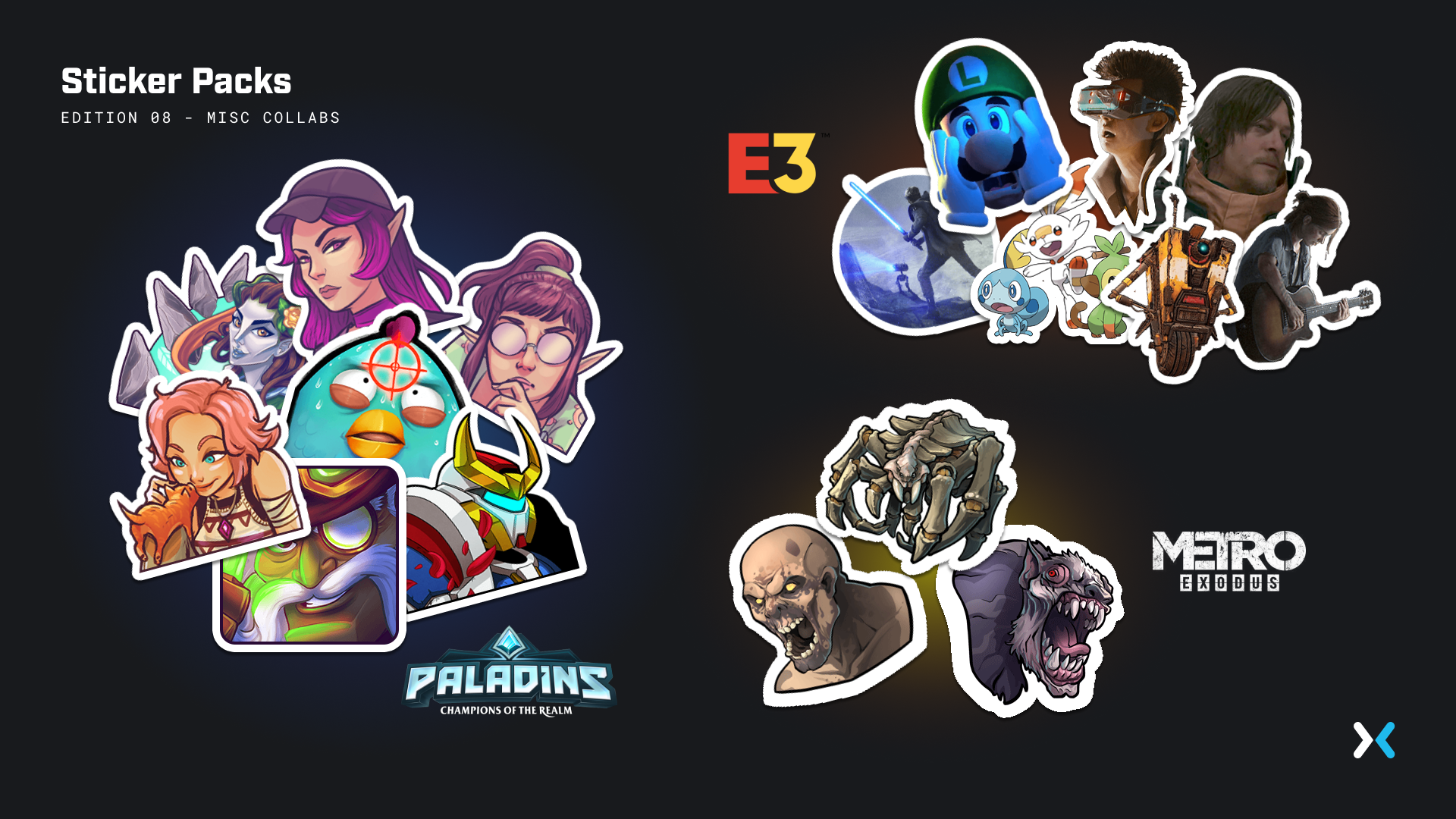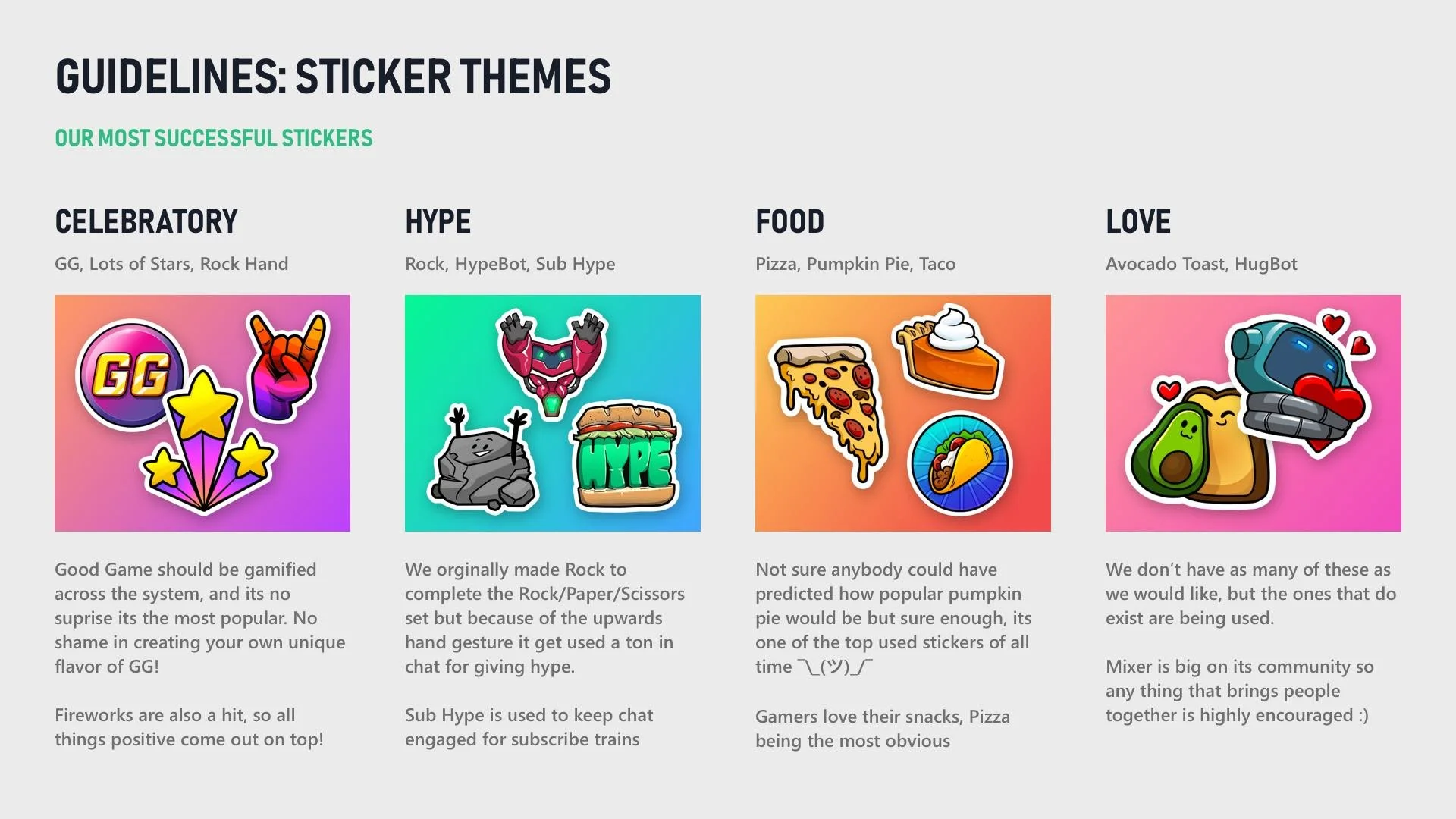 Part of many ways you can support streamers, stickers was a primary skill used in chat in Mixer’s game streaming platform. I was responsible for the art direction and concept phase of the initial set of stickers and creating guidelines for usage with external partnerships. To learn more about how Skills work, view my project “Mixer Season 2”