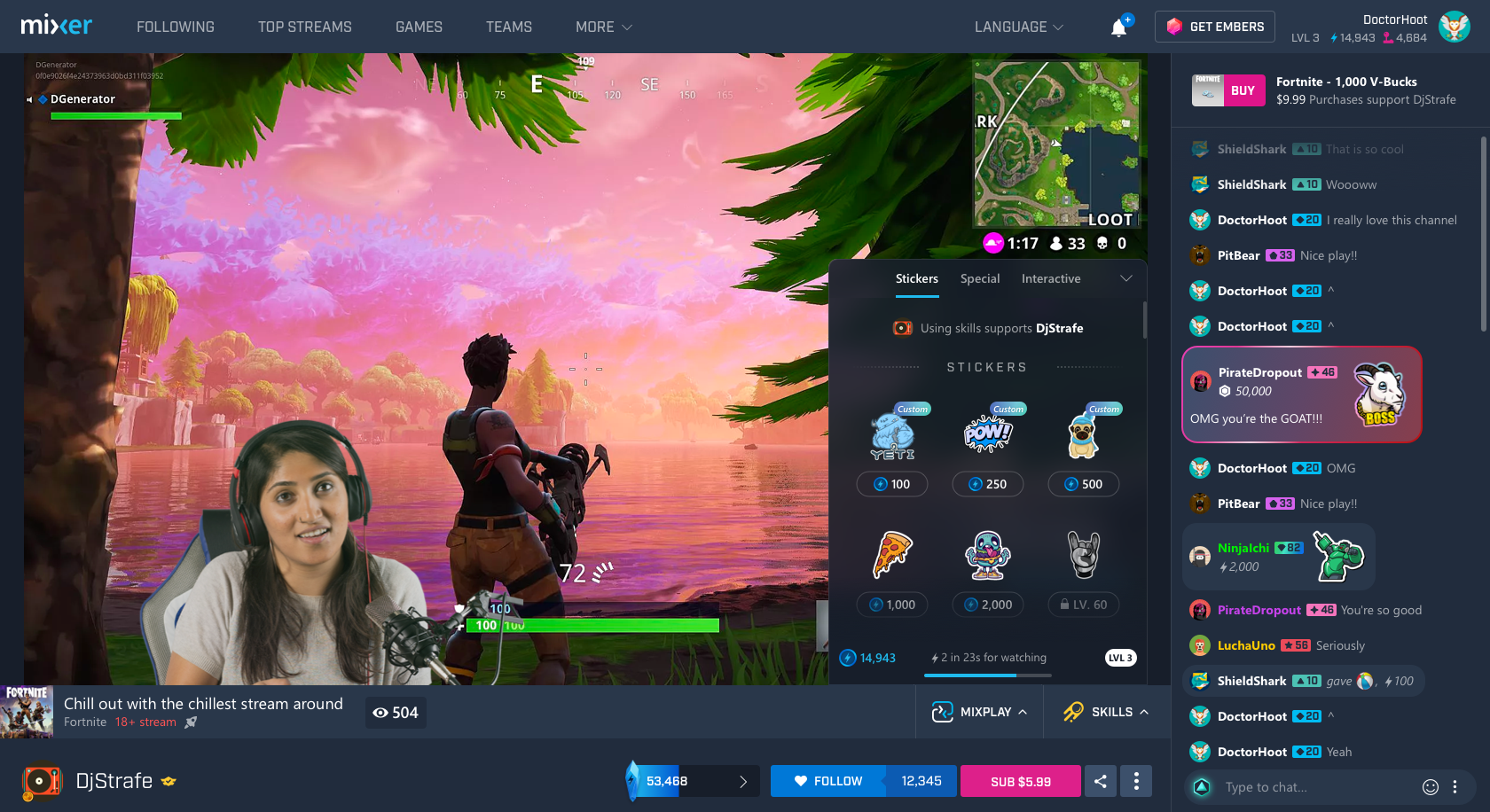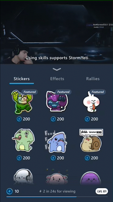 The first thing we built for chat with Season 2 was the introduction of Stickers. It’s a way of expressing yourself while also supporting creators by either spending passive currency (sparks) or paying for embers (premium), both of which streamers collect as patronage